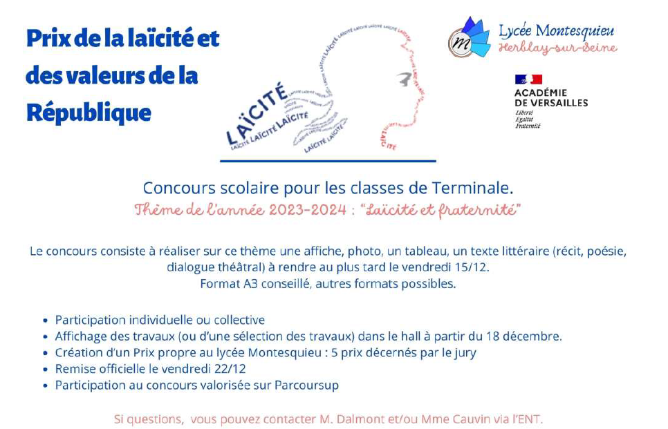 En accord avec notre proviseure Madame Soufi, pour l’année 2023-2024, le thème du concours a porté sur "Laïcité et fraternité" afin de faire écho aux actions de solidarité dans lesquelles nos élèves s’investissent déjà. Nous allons pérenniser ce concours en changeant de thème tous les ans (par exemple "laïcité et égalité").