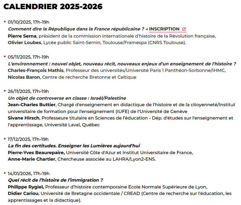 Les thématiques abordées sont articulées à certaines questions sensibles des programmes et seront l’occasion d’un dialogue entre historiennes/historiens et didacticiens ;