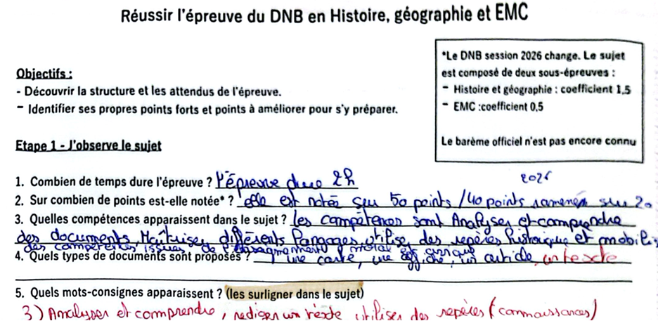 En début d’année de 3e, nous exposons les attendus du brevet, mais les élèves ne se représentent pas encore l’examen : les différents exercices qu’ils vont devoir réaliser en histoire-géographie et EMC, le temps nécessaire pour le faire, mais également la présentation formelle d’un sujet et son barème.