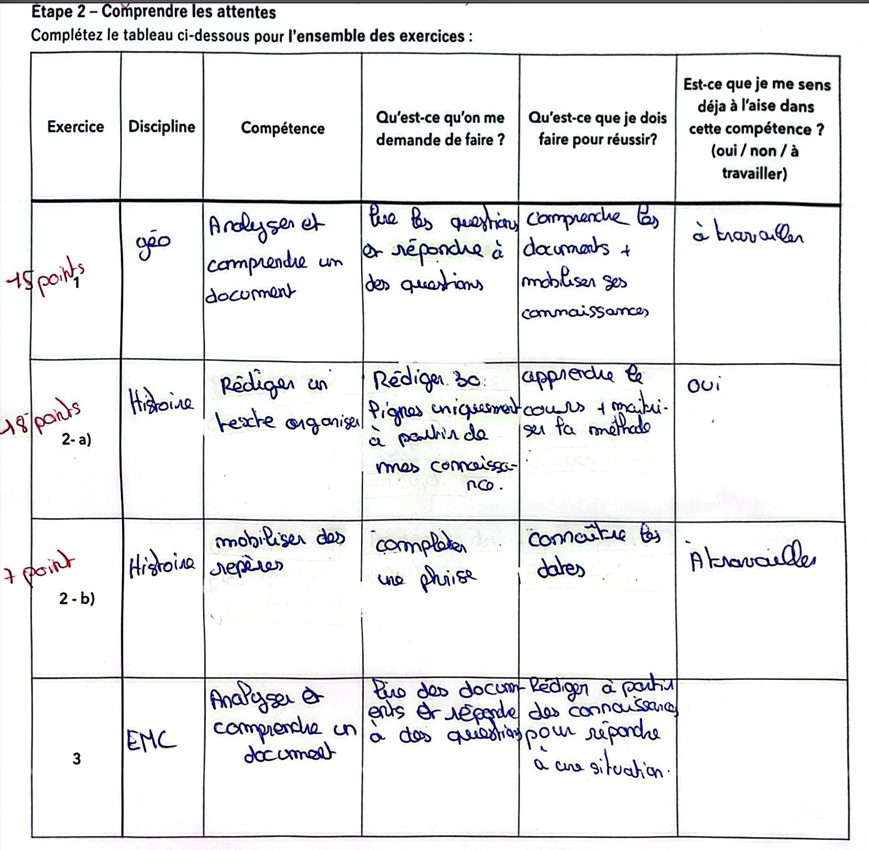 - « Qu’est-ce que je dois faire pour réussir ? » : ici les élèves identifient les stratégies à mettre en place pour répondre efficacement (apprendre mes leçons, travailler la méthode de la rédaction, travailler l’analyse de document)