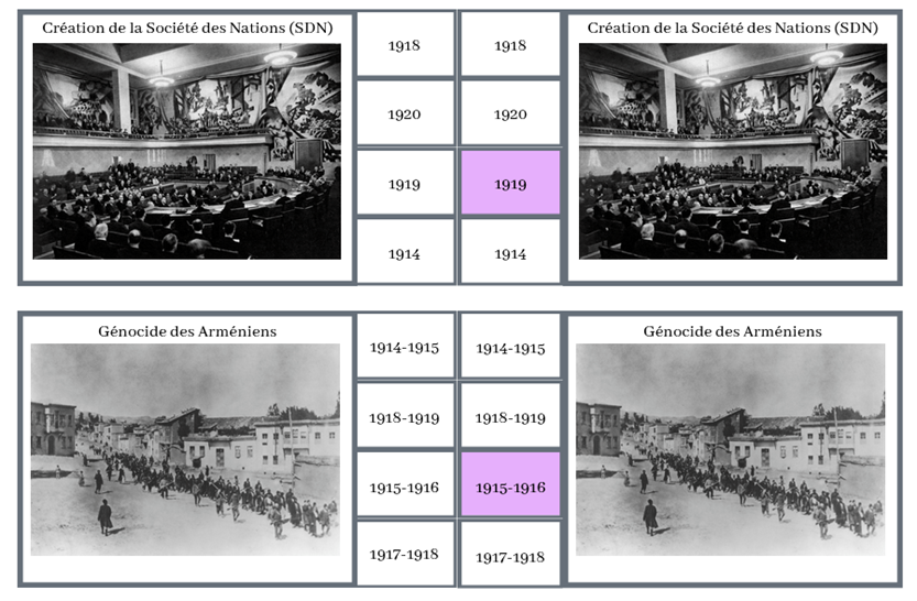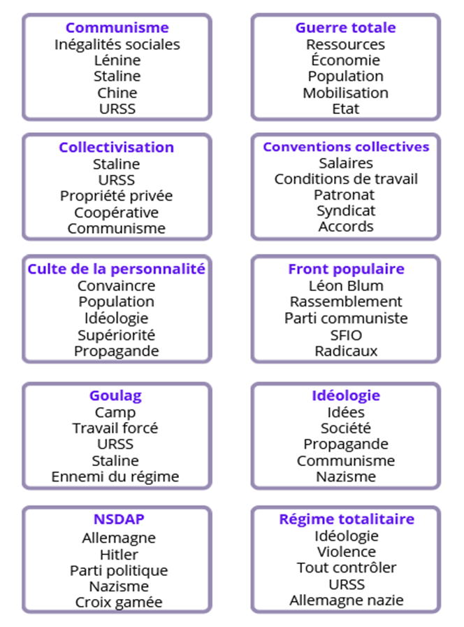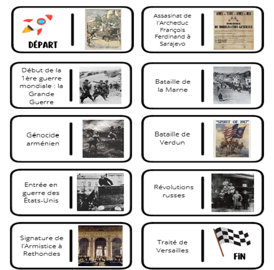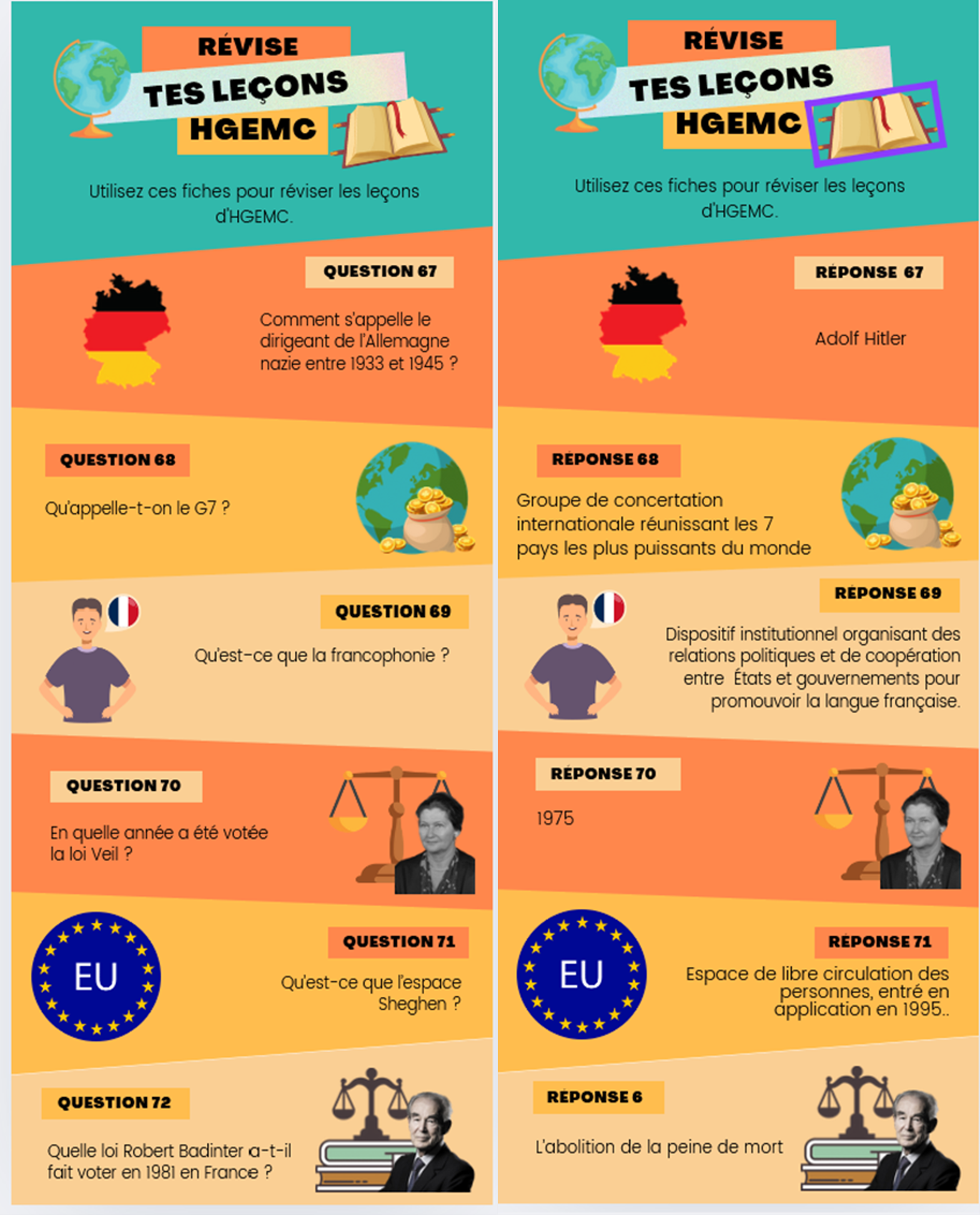 Un élève doit raconter à voix haute pendant 1 à 2 minute le récit proposé par la carte. Les autres élèves écoutent et réagissent : ils peuvent poser une question pour vérifier la cohérence, compléter l’histoire avec un détail historique, géographique ou civique. Le professeur et/ou la classe valorise la justesse des informations, la clarté du récit et l’utilisation du vocabulaire disciplinaire.
