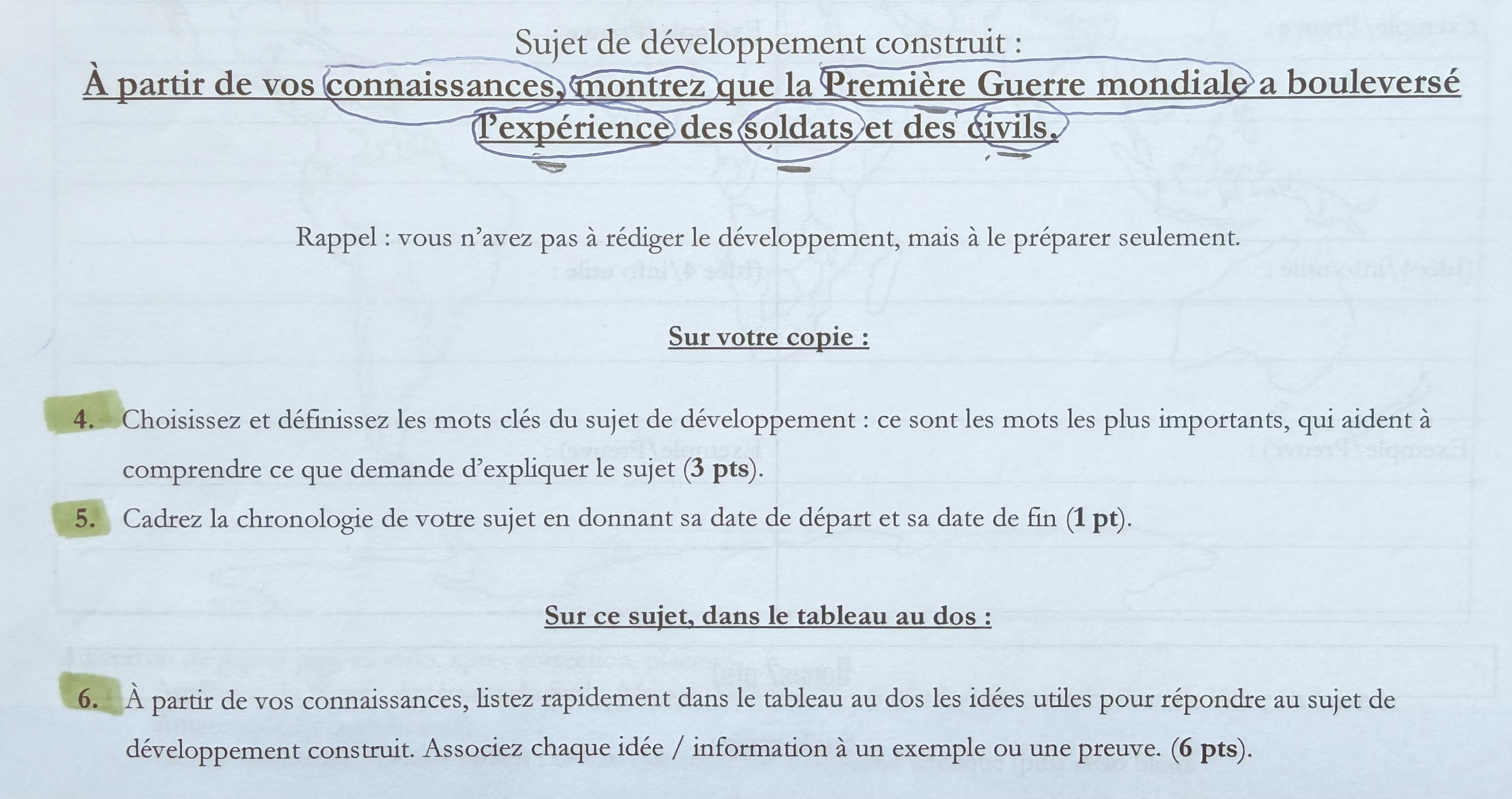 Cela peut prendre la forme d’une check-list : « Accroche-Analyse du sujet-Bornes chronologiques et/ou spatiales ». Lors des évaluations, quand les élèves sont à l’aise avec l’élaboration du plan, ils peuvent préparer la check-list de cette introduction, qui finalement reprend leur réflexion sur les mots clés de démarrage, voir se confond avec cette réflexion : leur brouillon n’est pas un temps perdu, mais un outil pour les aider. Progressivement, je leur demande de rédiger de rapides introductions qui reprennent le même rythme.