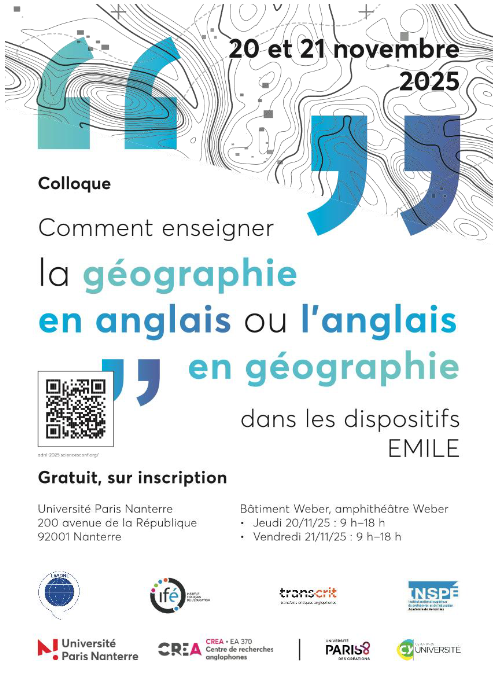 Les 20 et 21 novembre 2025, le LéADNL organisera à Nanterre un colloque autour de la question de l’enseignement-apprentissage de l’anglais langue étrangère (ALE) en section européenne, et plus particulièrement en classe de DNL géographie.