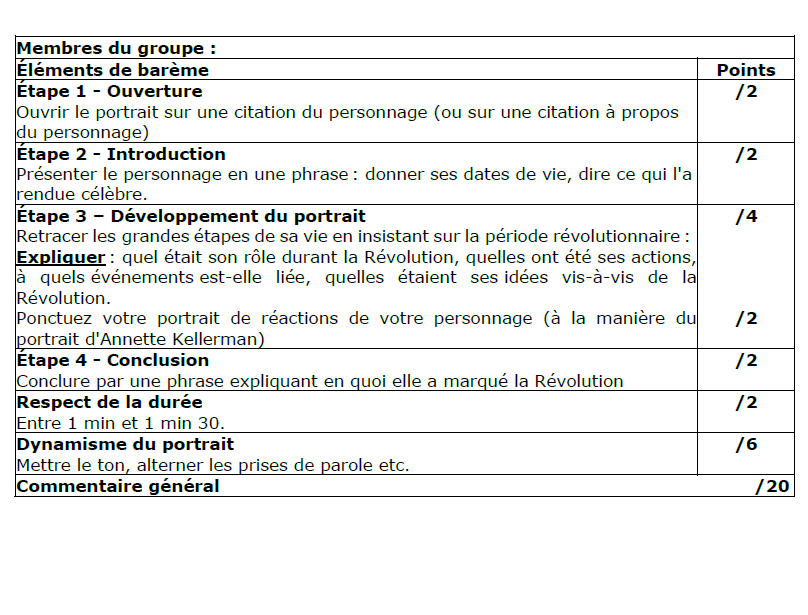Les groupes qui travaillent sur des personnages ont une fiche qui les guide dans la réalisation de leur portrait radiophonique en 4 étapes : ouverture par une citation, présenter la figure féminine en une phrase, retracer les grandes étapes de sa vie en insistant sur la période révolutionnaire et conclure en une phrase sur pourquoi elle a marqué la période de la Révolution française. Il est conseillé de faire partir les élèves de la fiche Vikidia des différentes femmes pour qu’ils puissent rapidement avoir une idée de l’essentiel.