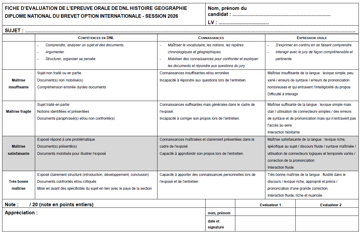 L’évaluation est globale et notée sur 20 (points entiers). La mention internationale est attribuée si le candidat obtient une note supérieure ou égale à 10/20 à chacune des deux épreuves orales (DNL et Langue/Littérature).
