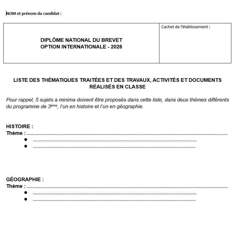 - La liste de travaux : le candidat doit présenter une liste (environ 5 propositions) validée par le chef d’établissement. Elle doit couvrir au moins deux thèmes différents du programme : l’un en histoire, l’autre en géographie.
